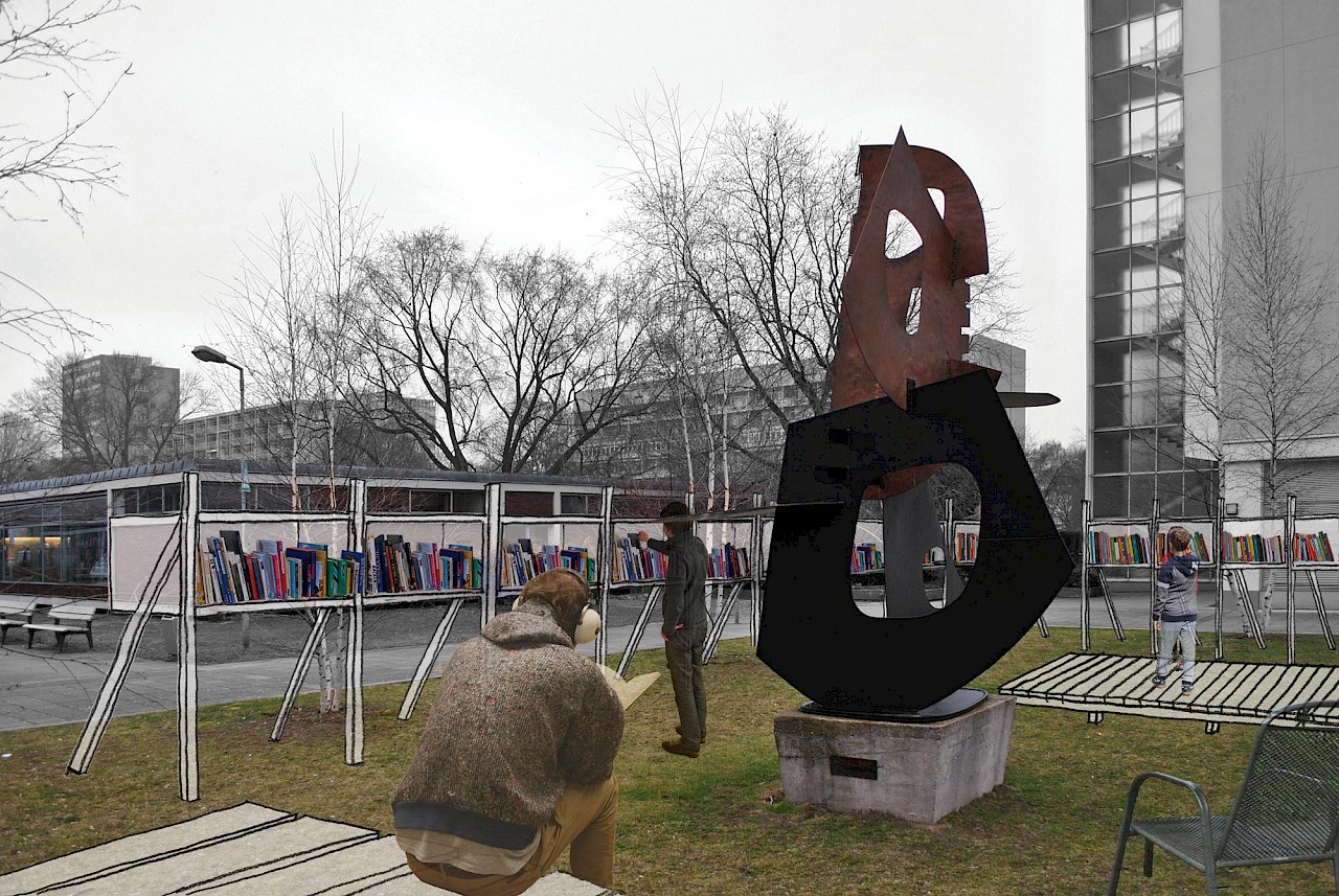 The proposal Inside Out is an open, collective library designed for researching new perspectives on the Hansaviertel. On the raised lawn behind the Hansa Library a book exchange library will be set up and from May and September grow to fill the 70 metres of shelf units. Readings and other events will also be held there.
