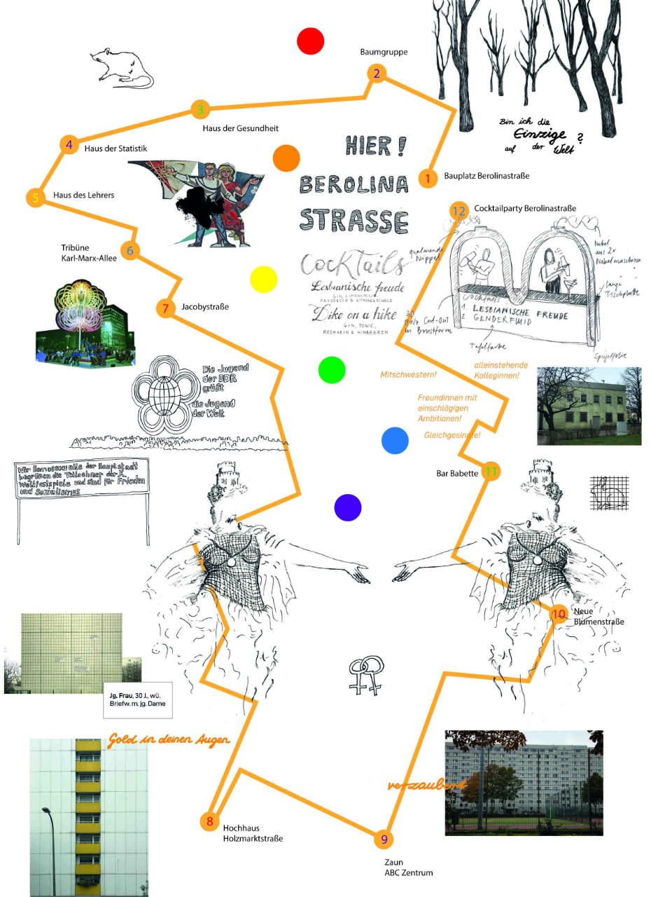 Ingeborg Lockemann’s walk, Hier, Berolinastraße!, leads participants to the location of a residential high-rise building currently being planned for lesbian women as part of the project RuT Frauen Kultur & Wohnen (RuT Women’s Culture and Housing) on Berolinastraße. No other building with this purpose and of this scope exists in Europe. Hier, Berolinastraße! looks back at the conditions homosexual women lived under in East Berlin. The walks incorporate public writings in different formats created specially for this project that illustrate the ways queer life found to encounter itself in spite of the enforced silence around the subject. Among other texts, the acrylic glass art objects bear phrasing once used by gays and lesbians in coded personal advertisements in the newspaper Wochenpost to search for partners under cover.