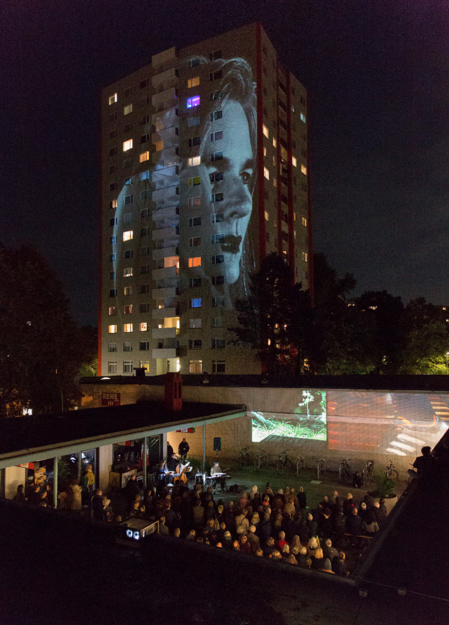 'deutsche wohnen (was singen die diven)' premièred as a musical and cinematic piece on September 14, 2019, in collaboration with groups and individuals from the Hansaviertel and the Karl-Marx-Allee. It was staged in the open-air inner courtyard of the shopping center at Hansaplatz. Projections onto the Baldessarigebäude as well as onto the walls in the courtyard were accompanied by a choir and musicians. In the performance, the different rhythms, temporalities and contexts were superimposed with real people, noises and actions on location. They updated the projections edited in the cutting room, and the music composed in the studio: the divas of the Hansaviertel began to sing.