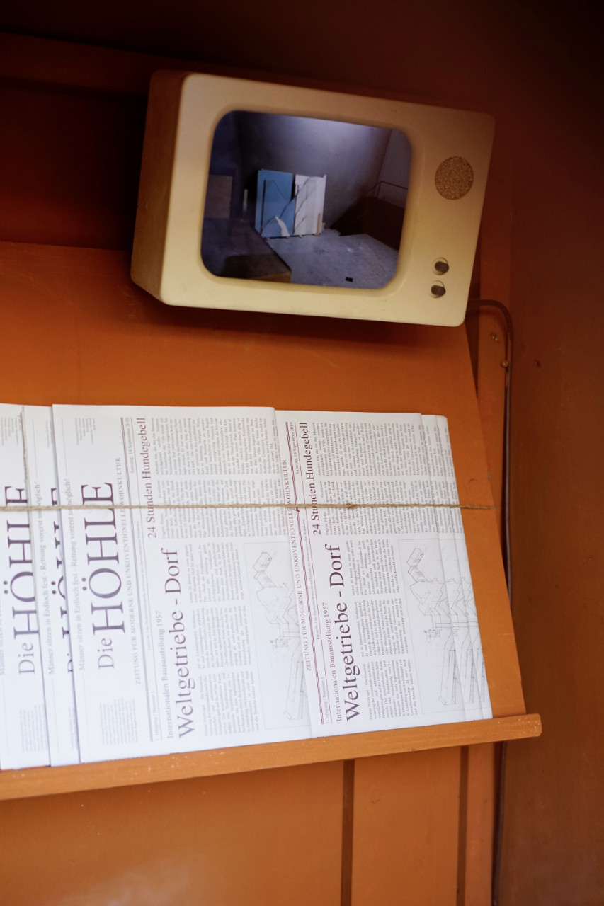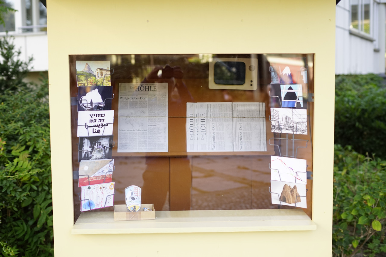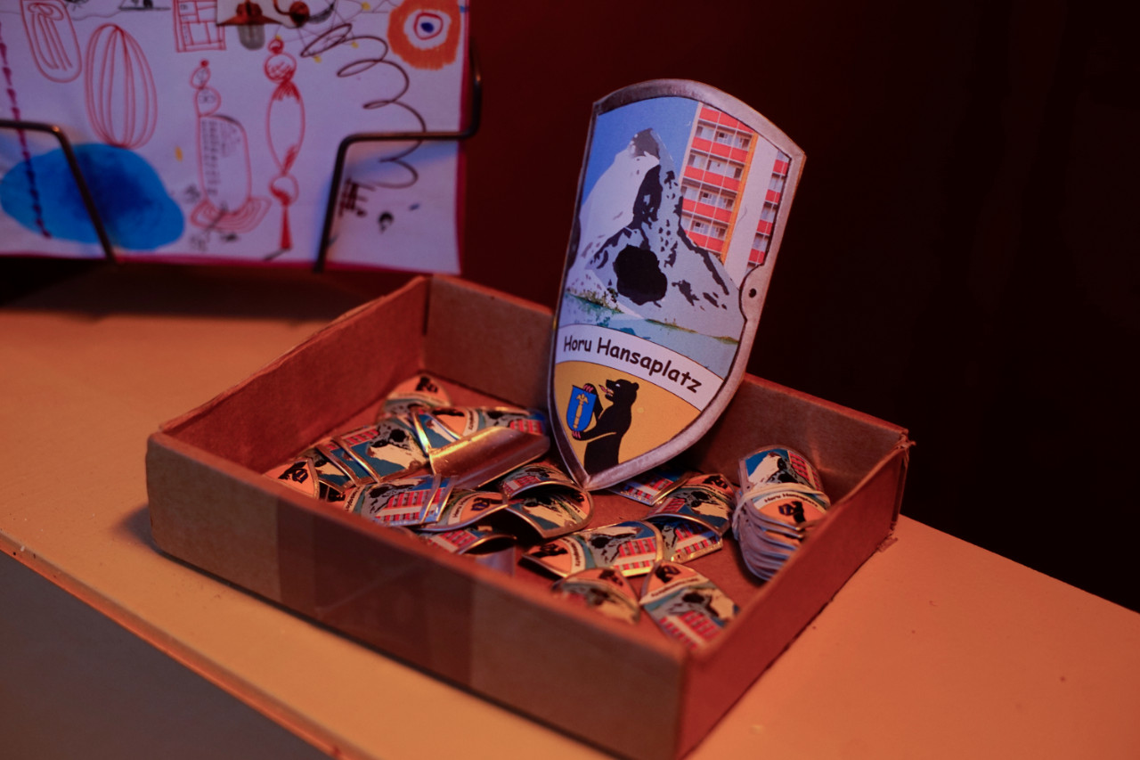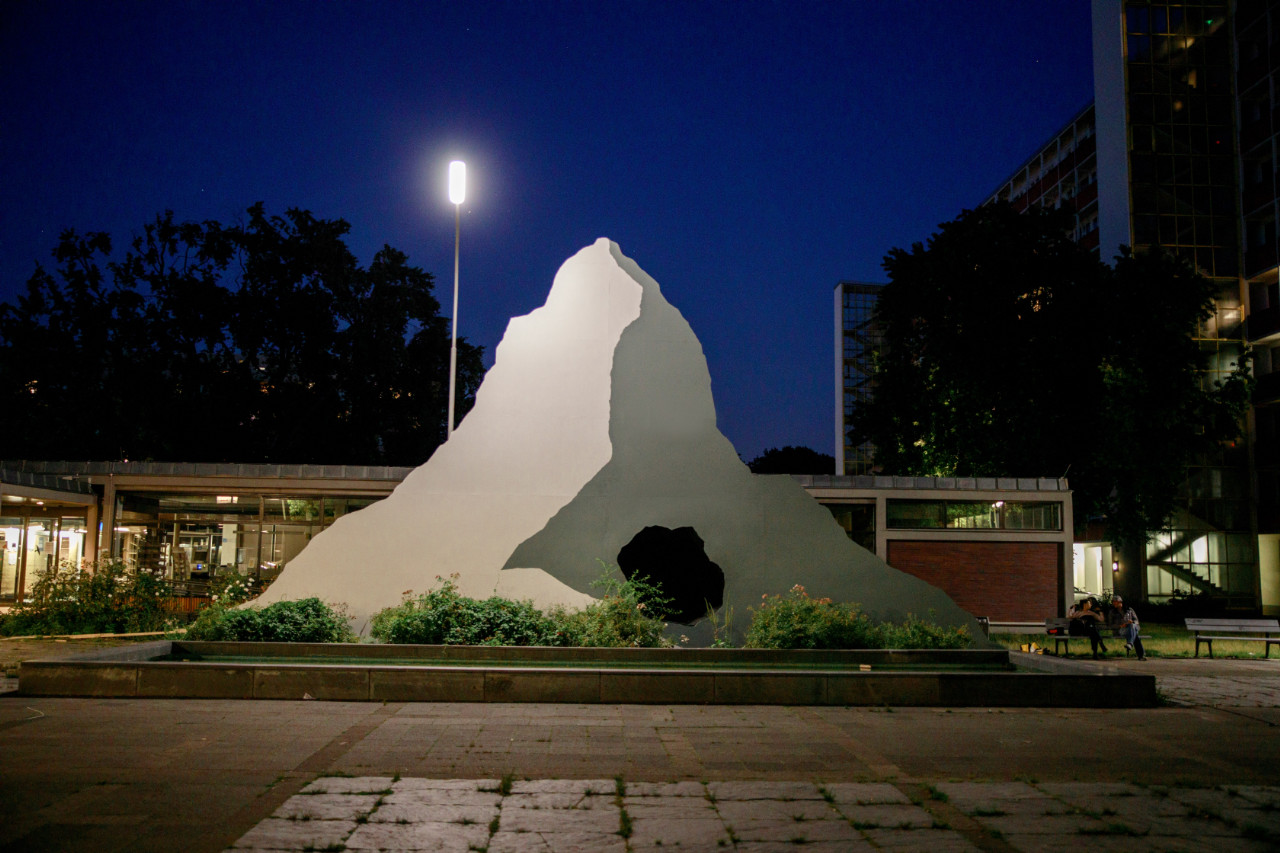 Das Hansaviertel ist 1957 im Rahmen der Internationalen Bauausstellung (Interbau) als „Die Stadt von morgen“ erbaut worden und gilt als ein Klassiker der architektonischen und städtebaulichen Moderne. Seit 1995 steht das Areal vollständig unter Denkmalschutz und konserviert damit auch diese Ideen. Architekturtourist*innen aus der ganzen Welt strömen ins Hansaviertel, um die Architektur der Moderne zu studieren und zu bestaunen. Durch Jan Köchermanns Installation Horu wird die einstige Stadt von morgen um eine Attraktion reicher und für begrenzte Zeit um ein „Alpenpanorama“ ergänzt: Das Matterhorn, auf Walliserdeutsch „Horu“ genannt, wird ab August 2020 vor der Hansabibliothek zu bewundern sein. Zwar nur acht Meter hoch und nicht über 4000 Meter über dem Meerespiegel, dafür aber mit einer Höhle. Auf diesen Berg und diese Touristenattraktion verweist und wartet bereits ein kleiner Souvenir-Shop mit Postkarten, in dem die Zeitung Die Höhle und Wanderstockmarken ausliegen. Aktuell lagert der Berg, zerlegt in seine Einzelteile noch in einem Keller, wo er als Bausatz auf seinen Auftritt wartet. Eine Überwachungskamera liefert rund um die Uhr eine Live-Übertragung des Berges in den Kiosk am Hansaplatz.