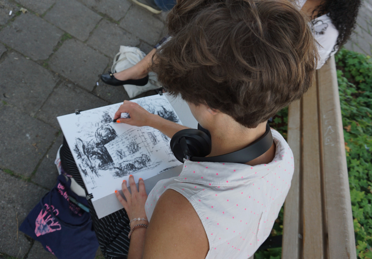 Angelehnt an das Format des in der DDR populären Zeichenzirkels, bot die Künstlerin Magda Voerster an insgesamt acht aufeinanderfolgenden Donnerstagen einen Zeichenkurs an, der sich an alle richtete, die gerne zeichnen. Gemeinsam wurde der II. Bauabschnitt unter die Lupe genommen und mit verschiedenen Techniken der eigene Blick geschärft.